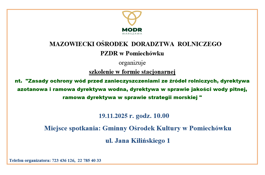 Mazowiecki Ośrodek Doradztwa Rolniczego – PZDR w Pomiechówku zaprasza na szkolenie stacjonarne poświęcone tematyce ochrony wód przed zanieczyszczeniami ze źródeł rolniczych.