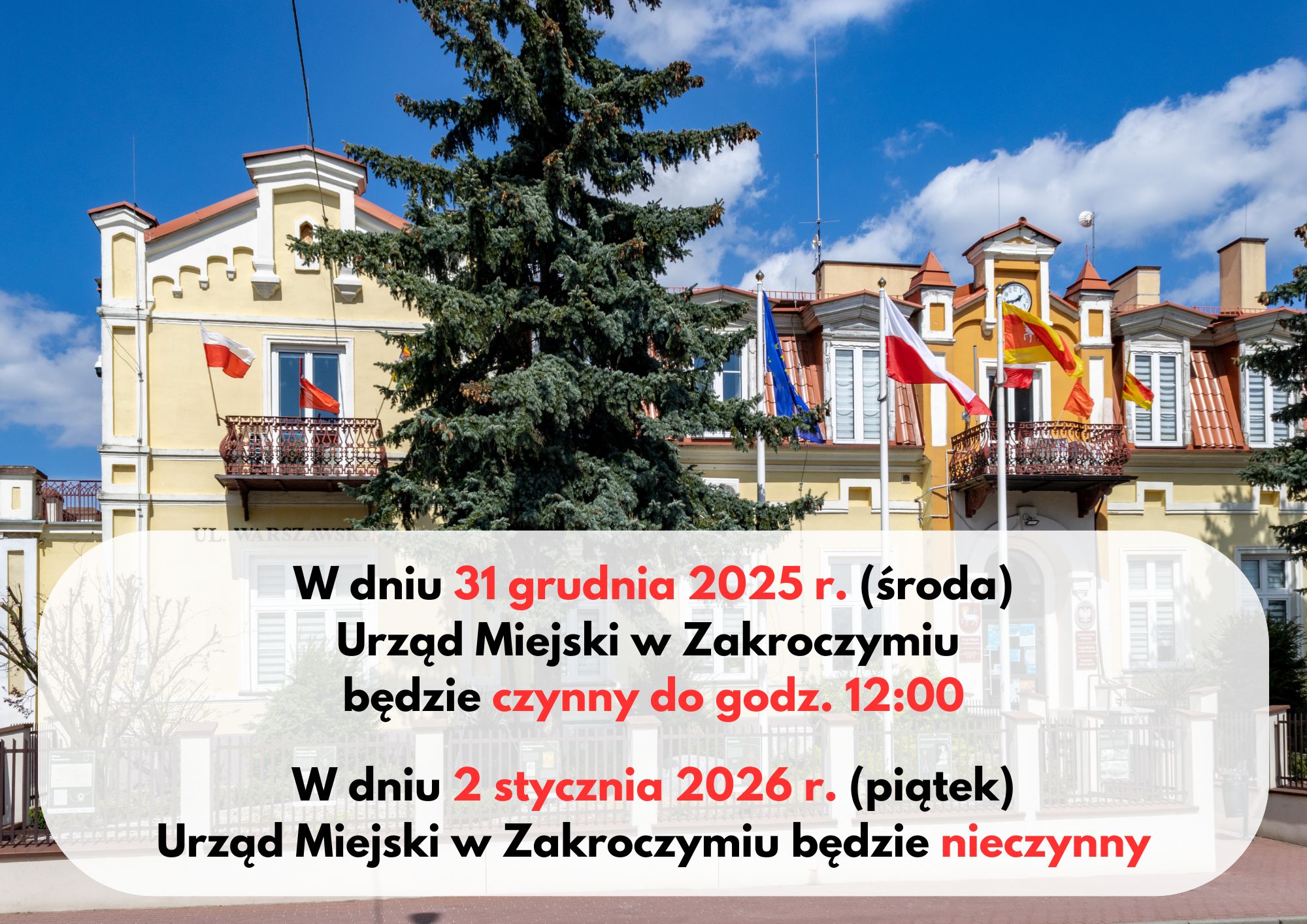 Uprzejmie informujemy, iż zgodnie z Zarządzeniem nr 163/2025 Burmistrza Zakroczymia w dniu 19 grudnia 2025 r. Urząd Miejski w Zakroczymiu: