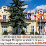 Uprzejmie informujemy, iż w dniu 7 kwietnia (piątek), Urząd Miejski w Zakroczymiu czynny będzie w godzinach 8:00-12:00.